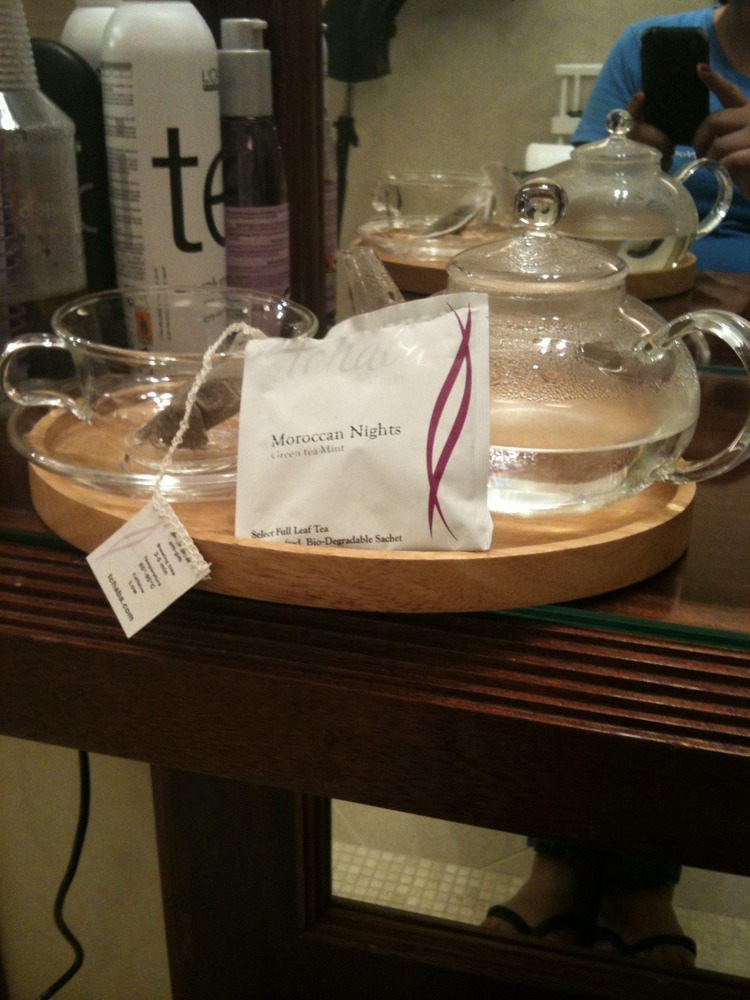 Today I looked in the book and decided to go for a bling salon to get my haircut. The venue Raffles Hotel, Amrita spa. The venue is lovely and very tranquil. I was a bit early so sat in the empty salon (no staff in there which was strange). Then after 10 minutes I was offered tea. Thought it was strange but said fine. What turned up was boiling water and a White box containing various types of herbal tea. Bit too healthy for me but what the hell. My choice was Moroccan nights as you can see: